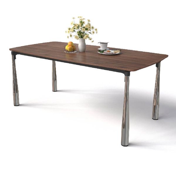 Bàn ăn chân sắt kiểu gậy bóng chày mạ inox màu nòng súng liên kết bằng khớp nhôm hợp kim với khung mặt bàn. Mặt bàn cốt gỗ plywood dày 18mm phủ melamin 2 mặt. Cạnh bàn vát chéo. Gỗ Plywood có ưu điểm về độ cứng, độ bền so với các loại gỗ công nghiệp khác. Ván Plywood chống cong vênh hiệu quả, chống ẩm cực tốt phù hợp sử dụng lâu dài.