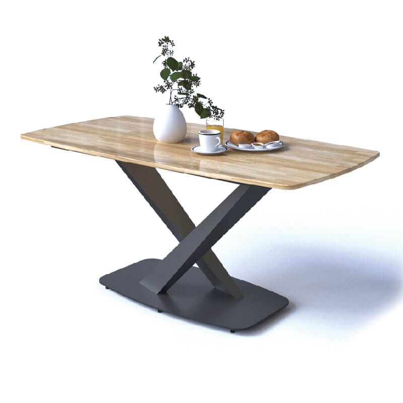 Bàn ăn chân đế thép tấm 8mm lắp ráp với 2 hộp thép xoắn, khung mặt bàn sắt hộp 20x30, sơn đen sần hoặc kem. Mặt bàn gỗ cao su ghép thanh dày 20mm. Có 2 màu sơn gỗ: nâu cánh gián và vàng tự nhiên. Gỗ cao su có tính đàn hồi, dẻo dai, bền bỉ, không ngậm nước và không thấm nước, dùng lâu vẫn giữ được độ mềm mại, thanh thoát.