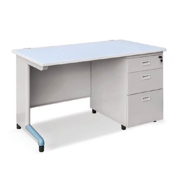 Bàn Làm Việc Cá Nhân, Bàn Hộc Liền BS14HK1-LG thuộc dòng bàn sắt hộc liền 1,4m không khay, mặt bàn gỗ công nghiệp phủ Laminate. Chân, yếm, hộc 3 ngăn kéo bằng sắt sơn tĩnh điện, mặt trước của hộc dập bo cạnh tròn. Bàn Làm Việc BS14HK1-LG có đế chân tăng chỉnh độ cao.