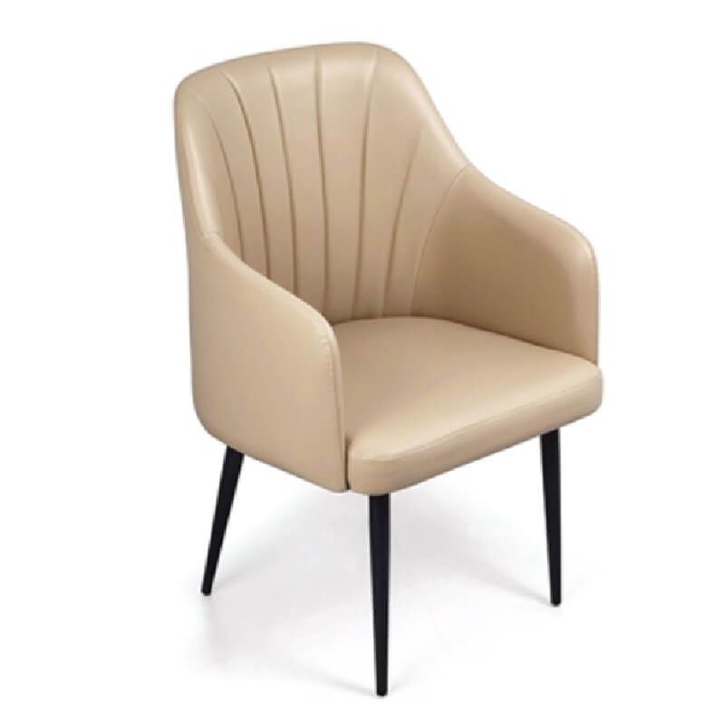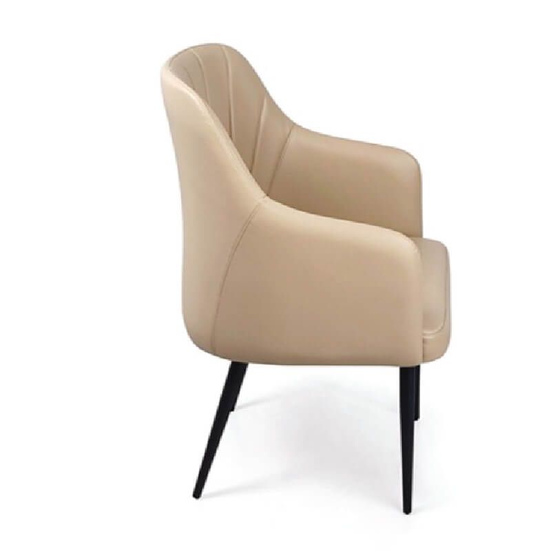 Thuộc dòng Ghế bản rộng có tỳ tay, được sử dụng như Ghế Ăn, Ghế Phòng Khách, Ghế Đọc Sách, Ghế Sofa Phòng Khách, Ghế Tiếp Khách Tư Vấn. Khung chân làm từ ống hộp tóp côn Ø32, sơn tĩnh điện màu đen sần. Ghế có đệm ngồi và tựa lưng bằng cốt gỗ Plywood dày cao cấp siêu bền, bề mặt bọc mút và da PU nhiều màu theo bảng màu tùy chọn kết hợp các đường may sang trọng.