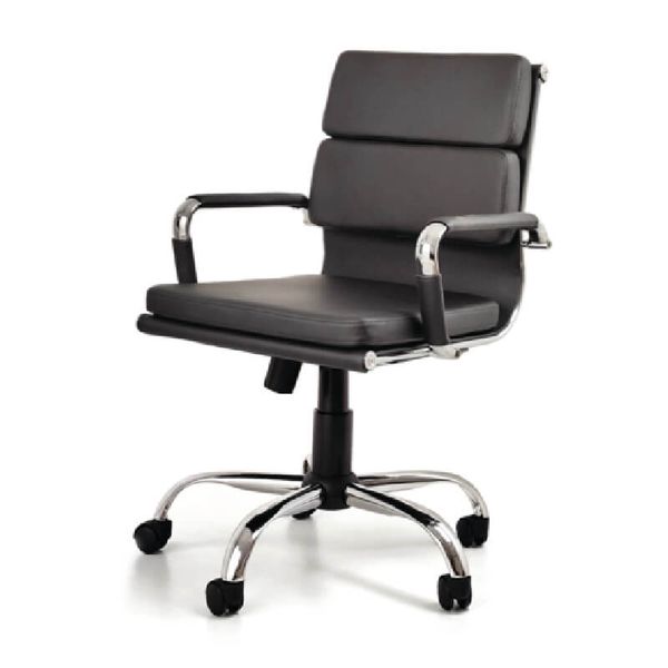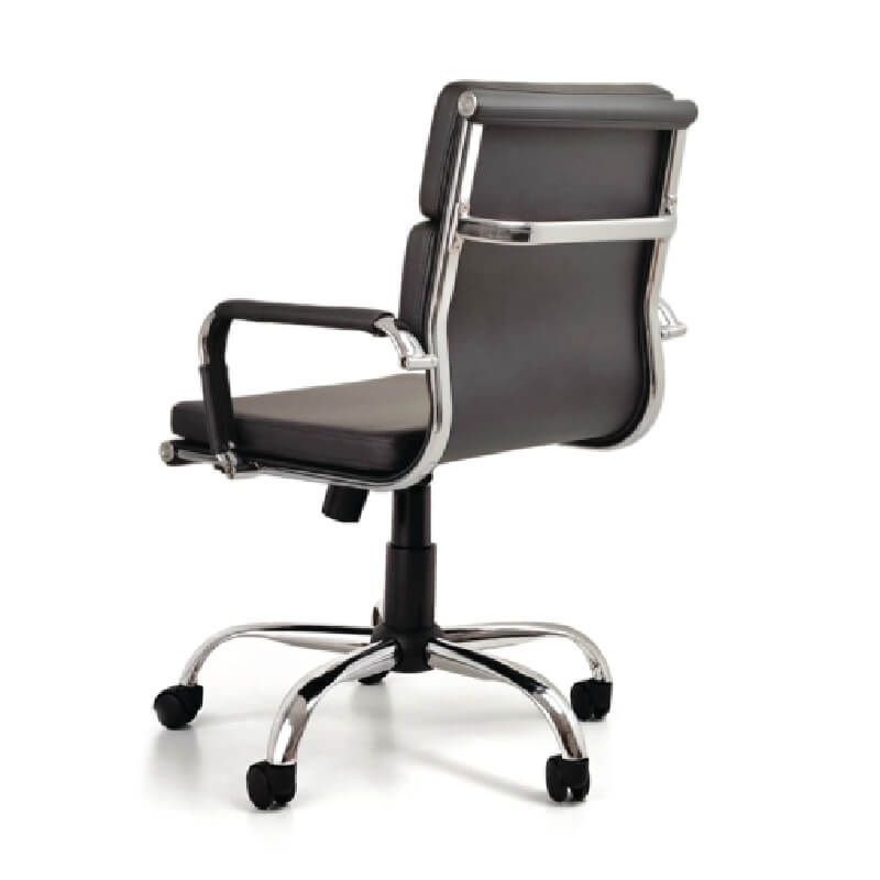 + Ghế xoay lưng trung, khung mạ. Lưng và mặt ngồi có đệm dày bọc da công nghiệp màu đen.