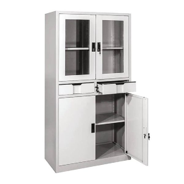 + Tủ đứng có 3 khoang, khoang trên cùng có 1 đợt di động, khoang giữa 2 ngăn kéo có khóa, ngăn dưới cùng có 1 đợt di động